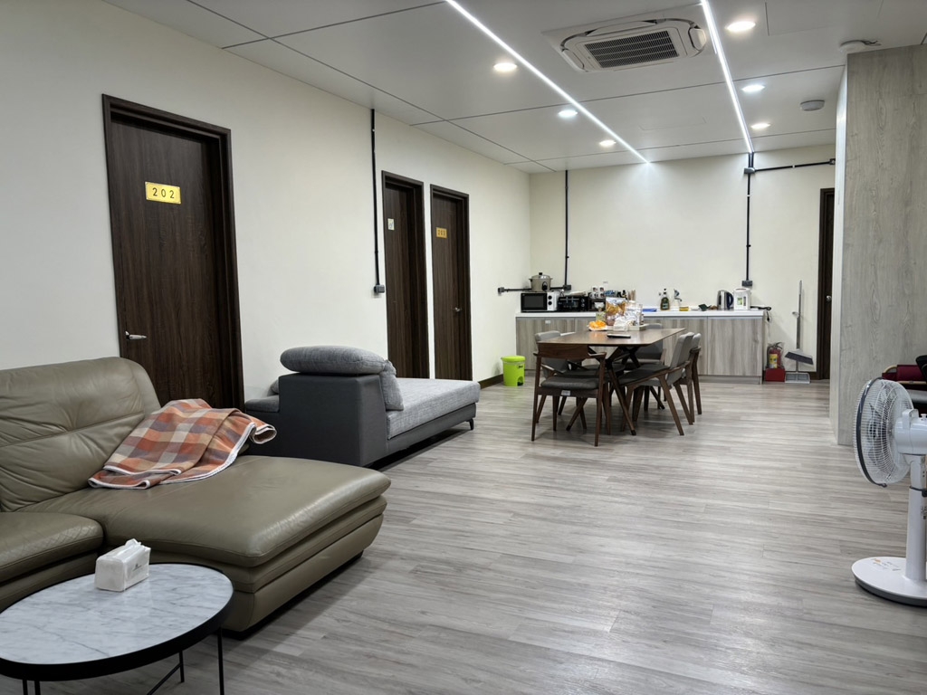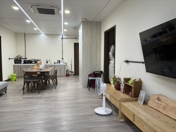 位於獨立套房外的交誼廳,空間溫馨舒適、寧靜,設有沙發座椅區、茶几、餐桌椅,並提供茶水區、電熱水壺、電鍋及飲水機,方便住宿者日常使用。