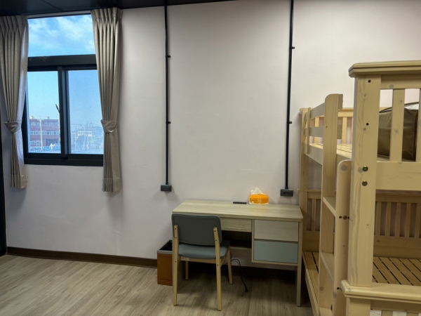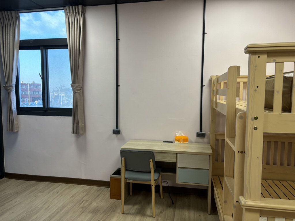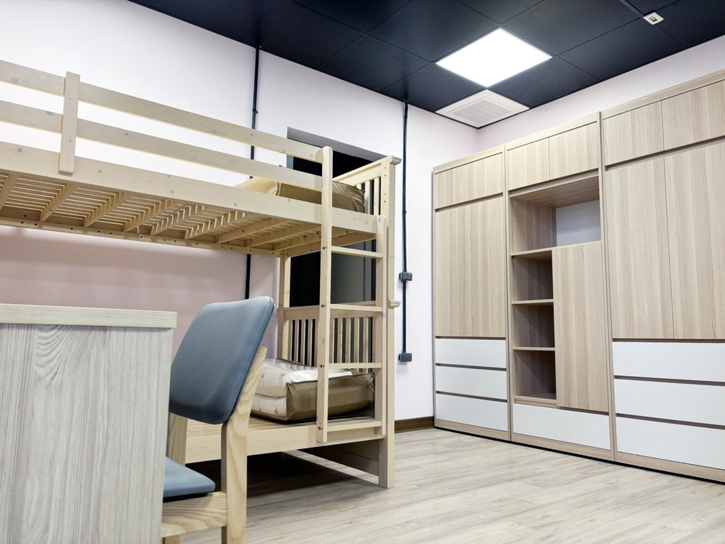 空間鋪設木質地板,整潔明亮,設有上下舖床位。房內配有冷氣與衣櫃,並設有二間廁所與二間淋浴間,能有效分流使用,維持良好衛生與生活品質。此外,公共區域設有洗衣機、洗衣槽、晾衣間與飲水機,方便住宿者日常使用。