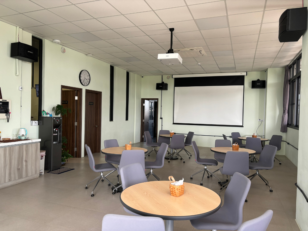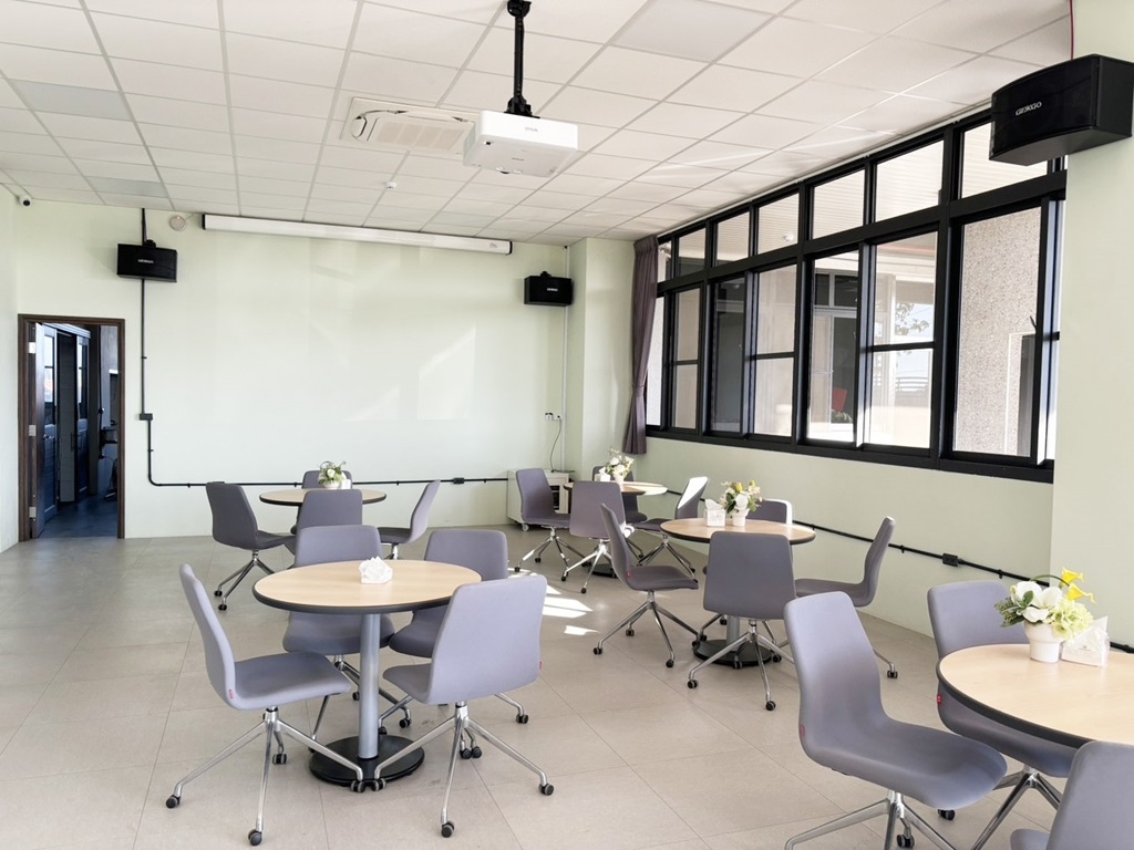 本視聽教室專為簡報、展示活動設計,空間配置完善,配備投影系統、音響設備及遮光設計,提供清晰穩定的視聽效果。